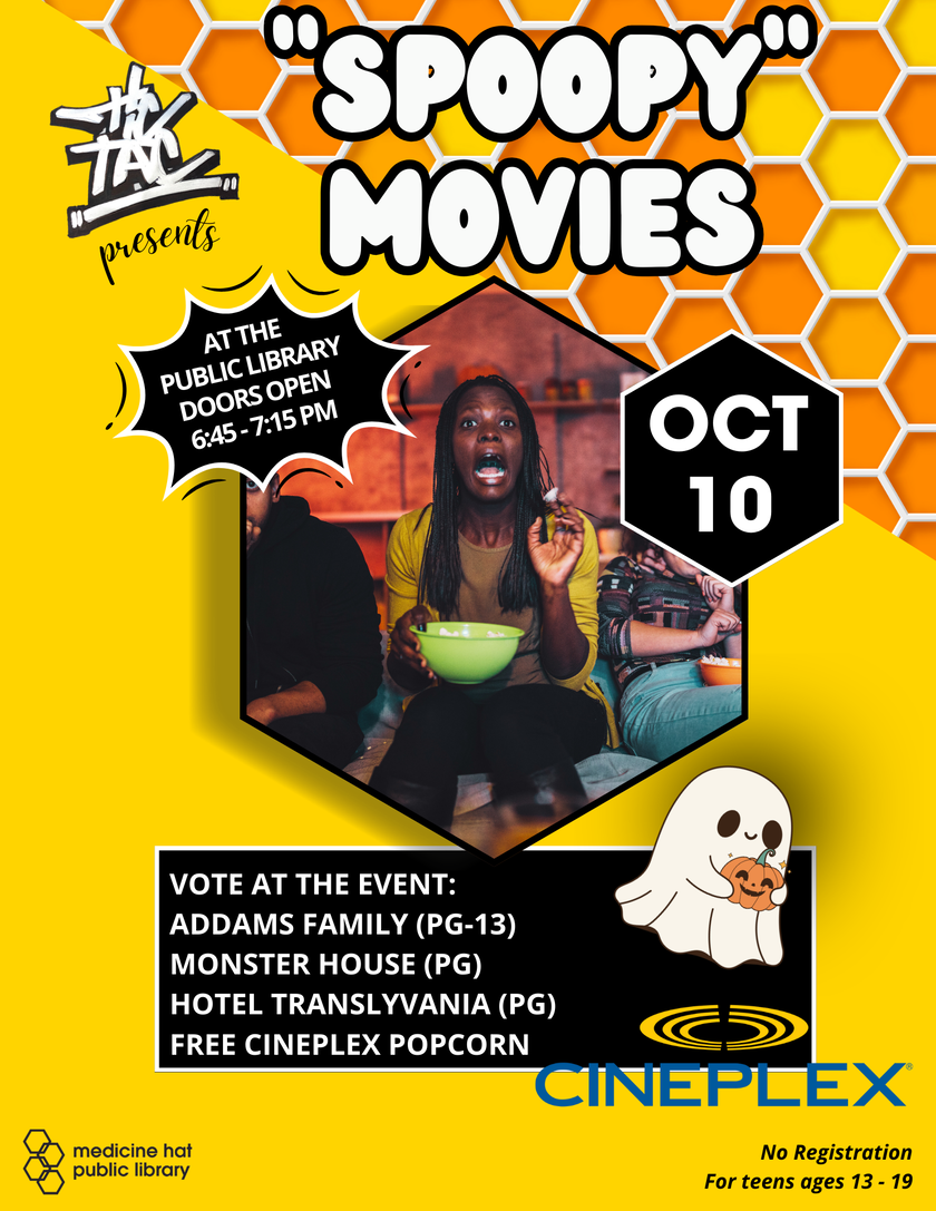 Celebrate all things "spoopy" (cute and spooky) with an after-hours movie night in our library theatre! Teens will vote between "Addams Family" (PG-13), "Monster House" (PG), "Coco" (PG), and "Hotel Transylvania" (PG) upon arrival. Popcorn donated by Galaxy Cinemas Medicine Hat. Doors open 6:45 - 7:15 PM then locked for your safety.